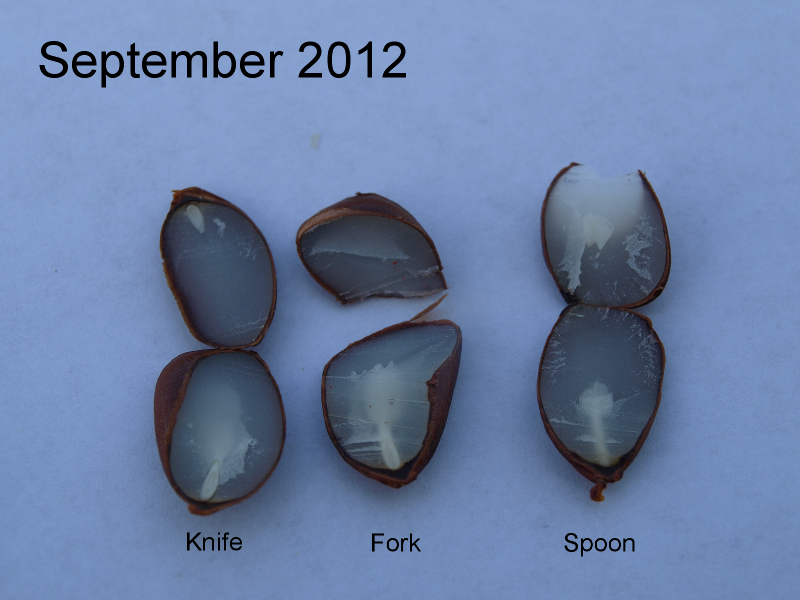 This one is a favorite of mine. Having many persimmon trees on my property, this is one that I look forward to doing every year. Unfortunately, I don't always get pictures taken and posted. As the theory goes, you can tell how severe the upcoming winter will be by cutting open the seed of the persimmon fruit and looking at what is inside. There are three possible things you will find: a fork, a knife, or a spoon. Here is what this means: